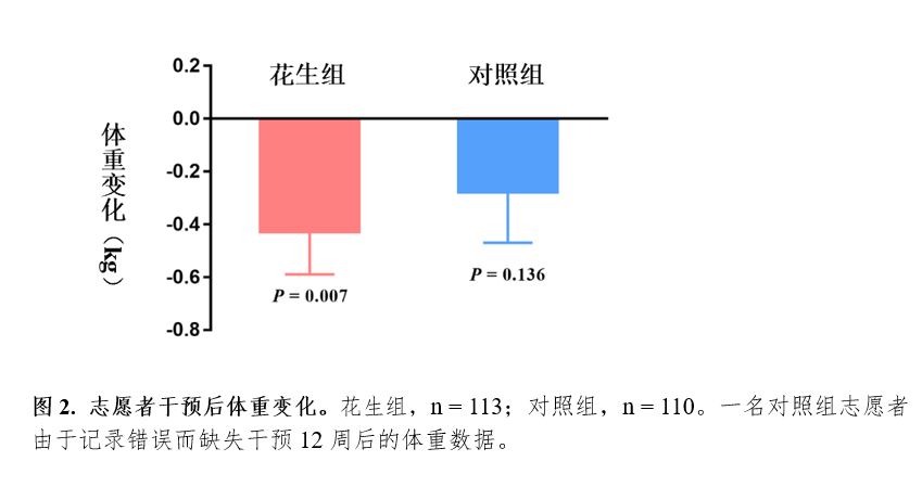 3)尽管花生脂肪含量较高,经12周的干预花生组志愿者的体重比干预前边缘显著降低(P = 0.007)(图2)。