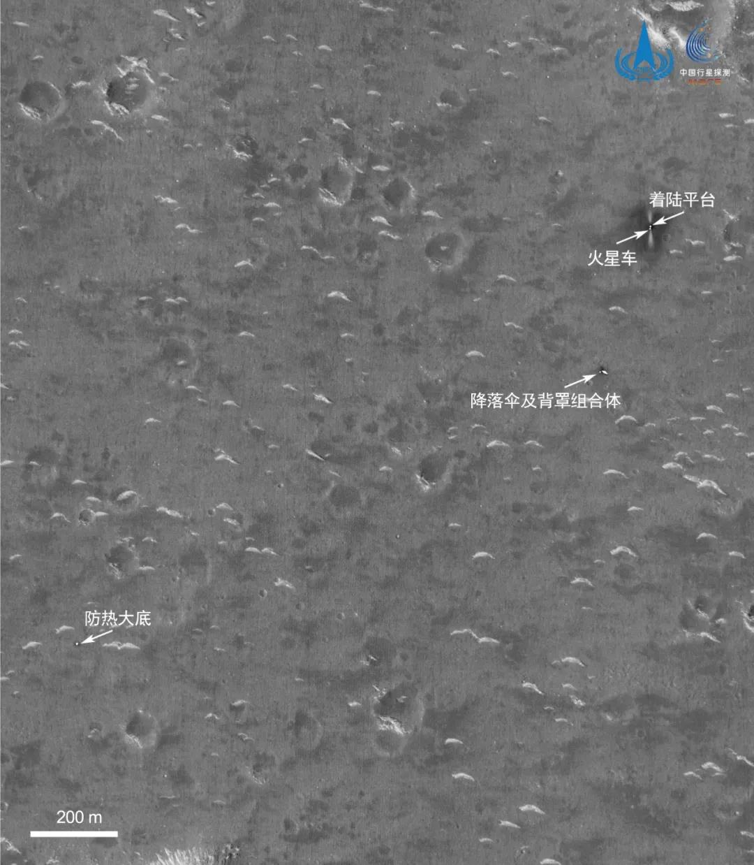 6月2日环绕器拍摄的着陆区图像,图中可分辨出着陆平台、火星车、降落伞及背罩、防热大底的相对位置。