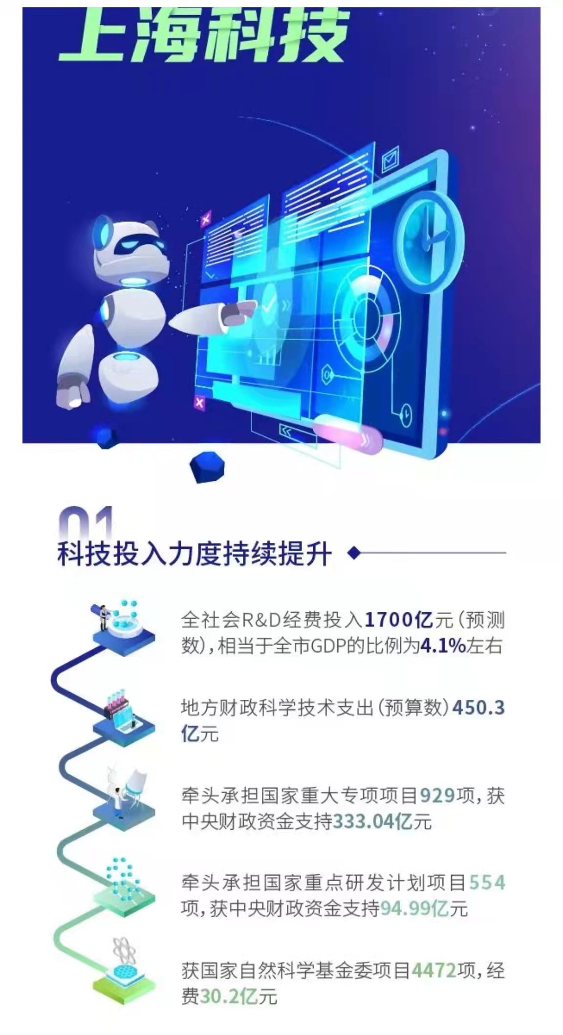 2021年,上海科技投入稳步增长,承接国家重大任务“一马当先”。全社会R&D经费投入1700亿元,相当于全市GDP的比例为4.1%左右。牵头承担国家重大专项项目929项,牵头承担国家重点研发计划项目554项,获国家自然科学基金委项目4472项。一批市级科技重大专项启动实施,包括硬X射线预研项目、量子信息技术、硅光子、超限制造等。