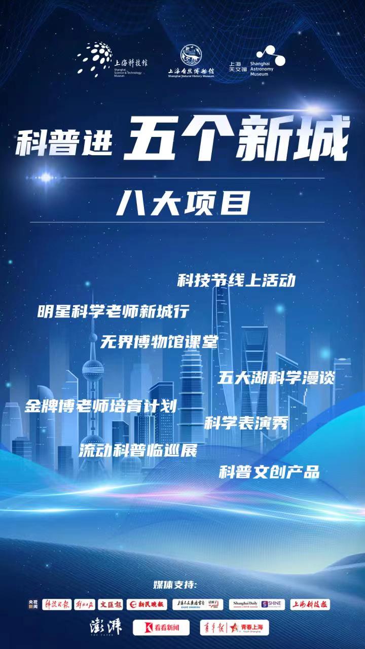 经过三个月的探索打磨,“科普进五个新城”活动目前已形成“科技节线上专场活动”“明星科学老师新城行”“无界博物馆课堂”等八个子项目,其中,线下教育活动有五大系列49项,线上教育资源有五大系列72项。