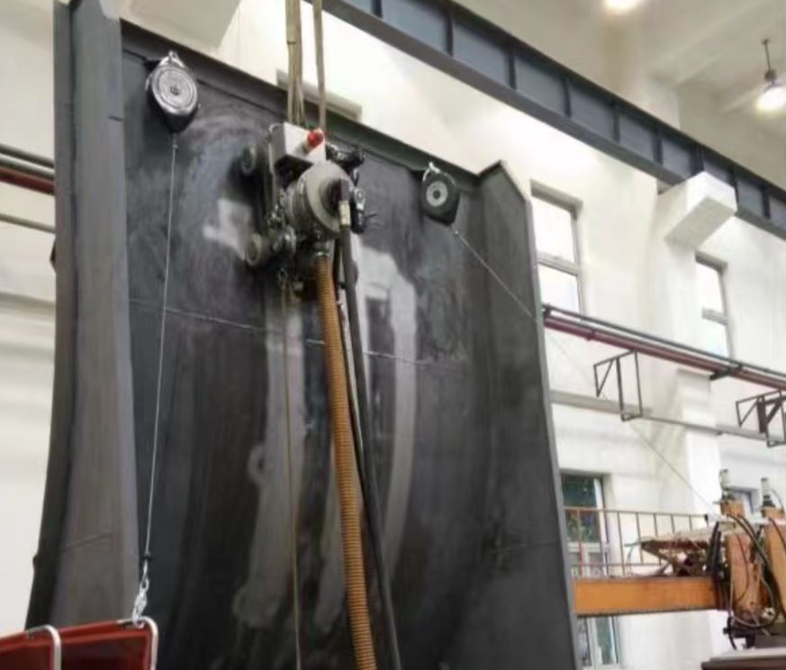 ▲外高桥造船实验车间中的喷砂除锈爬壁机器人