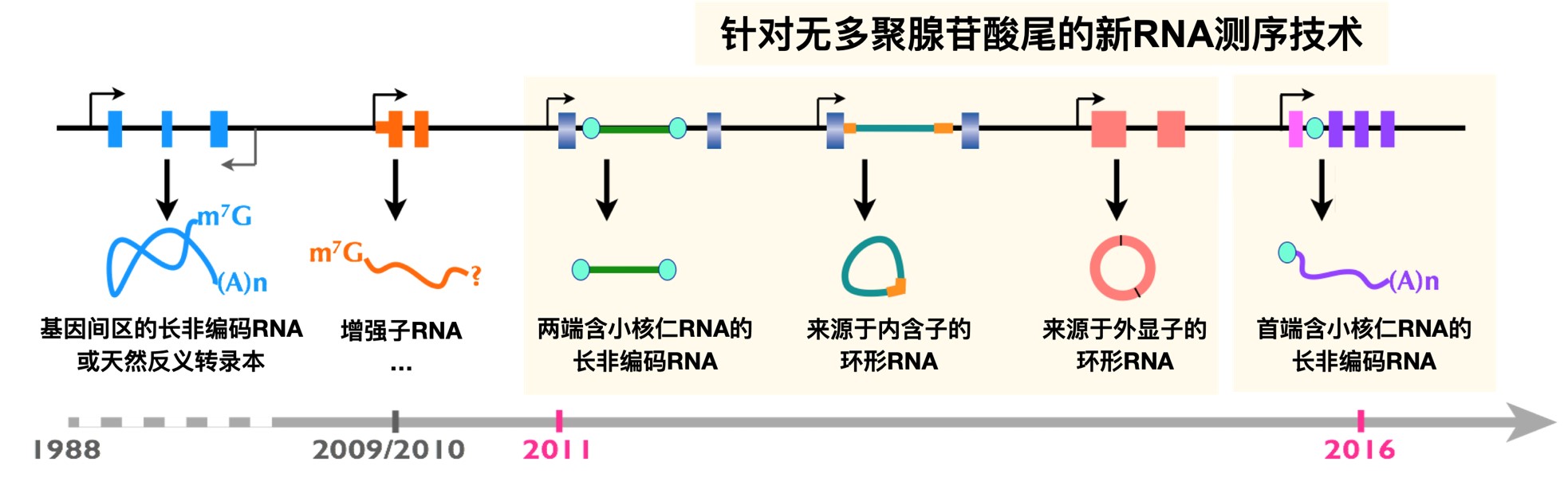 基于这个猜想,我们实验室创建了针对无多聚腺苷酸尾RNA的研究新体系,为发现新型长非编码RNA分子奠定了基础。通过对人类细胞中无多聚腺苷酸尾转录本的深入分析,我们相继发现了来源于内含子的带有小核仁RNA的长非编码RNA家族、多基因连续转录加工产生的SPA长非编码RNA家族,以及环形长非编码RNA(简称环形RNA),并证明这些RNA分子具有全新的生成途径和重要的生物学功能。