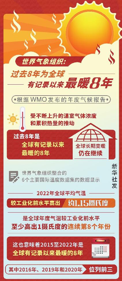 5月,WMO在一份报告中预测,受温室气体排放和厄尔尼诺现象影响,2023至2027年这5年内,至少有一年会打破2016年创下的高温纪录,概率高达98%。