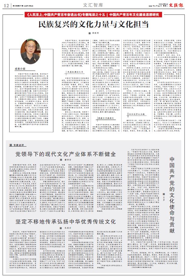 中国共产党是深具文化使命感的政党。在党开创和团结领导各族人民共同推进的伟大事业中,文化建设始终发挥着“举旗帜、聚民心、育新人、兴文化、展形象”的引领作用。党领导的文化建设源于近代以来中国人民反帝反封建的不屈斗争和对民族解放、国家独立和人民富强道路的艰难追寻;缘起五四运动对马克思主义真理的发现和建设一个新中国的文化愿景。在百年奋斗的每一个阶段,党都制定了明确的文化纲领,用以指导文化实践,始终用真理的光芒和思想的火炬照亮前行的道路,用理想和信念为党领导的事业攻坚克难、走向胜利凝聚力量。