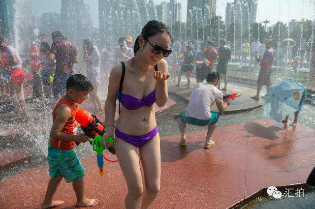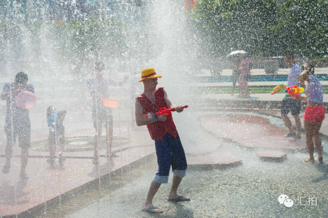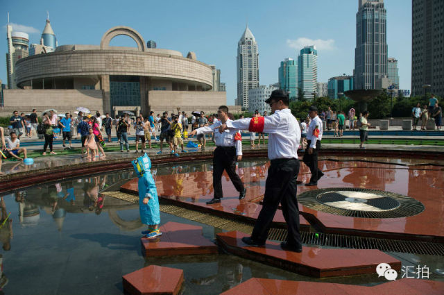 今天,上海启动高温模式。午后,人民广场喷泉中嬉水的人们很热也很high。