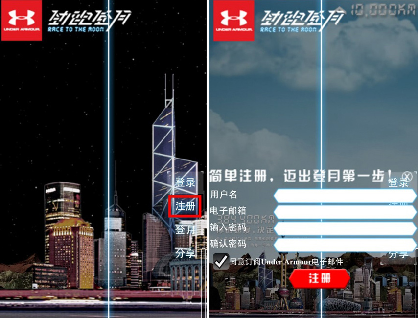 这,将是人类历史上的纪录。地球到月球的384,400公里,现在由你、我、他……大家一步步跑近。请在登月前先登陆 racetothemoon.underarmour.cn,成为登月成员,上传你每天的劲跑公里数,就有机会获得UA丰富礼品!记着,你的速度,决定我们登月的进度!请立即起跑登月!