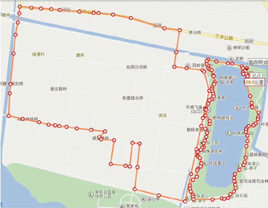 半马线路:明珠湖大草坪—明珠湖中门岗—明珠湖路—三华公路—新建公路—堡湖路—大新五队—西沙湿地—明珠湖中门岗—明珠湖半圈—明珠湖北门,实测为21.09公里。