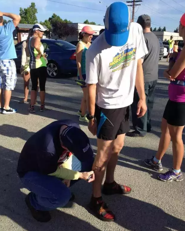 在现场我看到,选手的号码是由志愿者用马克笔写在跑者的胳膊或者腿上的——这解决了我对于没有号码布的困惑。
