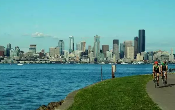 眼前豁然开阔,西雅图市区密集的高楼大厦、太空针、摩天轮等等都静静地矗立在蓝色大海的另一边,清晰可见,又触不可及。