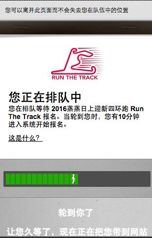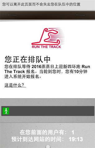 2016蒸蒸日上迎新四环跑采用排队报名系统,一旦进入报名通道的选手数量达到一定峰值,通道外的选手将根据点击报名通道的先后顺序自动排列,等待进入报名通道。