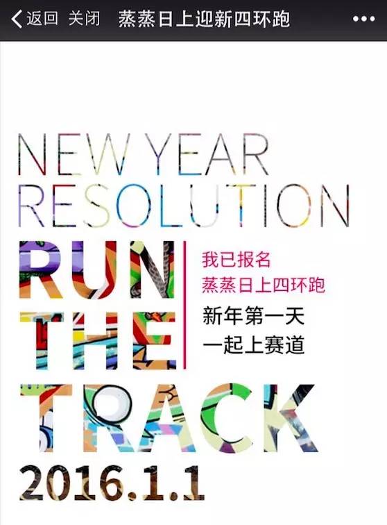 2016蒸蒸日上迎新四环跑的名额来之不易,完成报名后一定想好好炫耀一番。报名完成之后系统会自动跳转至赛事海报页面,点击右上角的分享页面即可把自己的新年愿望和宣言,与赛事海报一起分享至朋友圈。