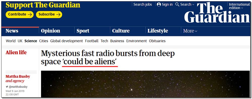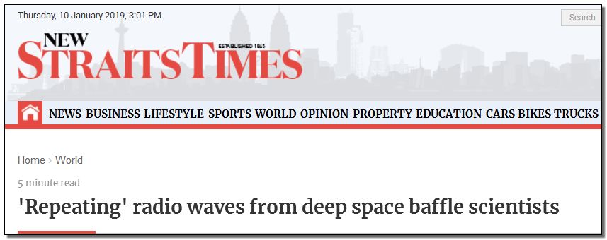 接连发现这一现象的新闻,被英国广播公司、英国《卫报》、美国《国家地理》杂志等众多媒体争相报道。其中一个重要的原因是,它们来自15亿光年外,“不排除是外星智慧的迹象”。