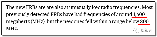 这次的2018年的FRB除了上面说的,还有一个非常不同的特点!就是频率特别低!以往的FRB多在1400MH左右,而这次检测到了低到了400~800MHz。