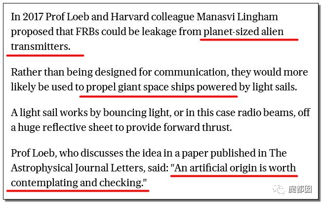 早在2017年的一份研究报告中,哈佛大学的教授就认为这个极有可能是来自宇宙飞行器的信号,“巨大的宇宙飞船”,“这个人为来源必须被验证和考虑进去”。