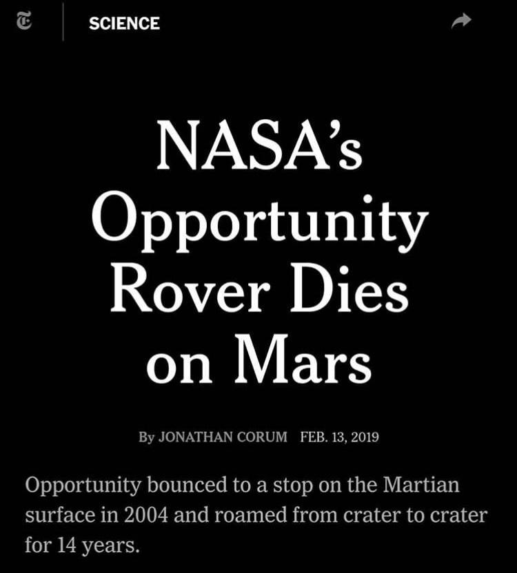 美国国家航空航天局(NASA)将在美东时间2月13日14时(北京时间2月14日凌晨3时)召开新闻发布会,宣布在火星上的“机遇号”探测器在登录火星15年之后“死亡”。NASA的火星车“机遇”号在超期工作15年(5352个火星日),并在火星上发现了水的存在。工作结束的原因是沙尘暴导致其太阳能板无法工作,NASA在向其发送800余条指令试图唤醒“机遇”号无果后,宣布这台传奇火星车“死亡”。