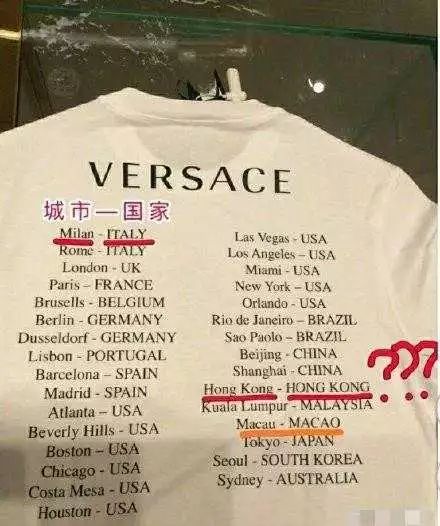 值得注意的是,意大利奢侈品牌范思哲正因在一款T恤上将香港、澳门列为国家一事而“亡羊补牢”。