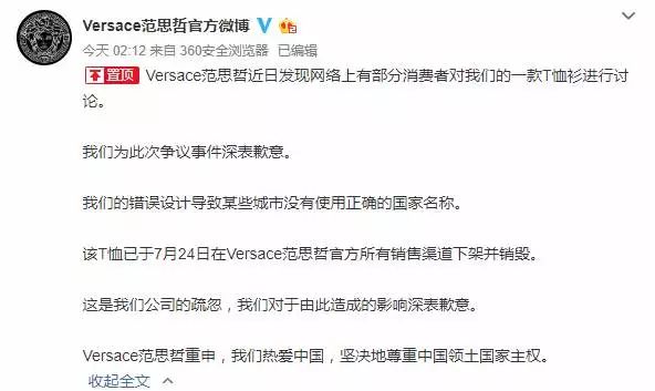 当天凌晨2点12分,范思哲就此错误设计致歉。道歉声明中指出,该T恤已于7月24日在Versace范思哲官方所有销售渠道下架并销毁。同时,声明重申,范思哲坚决地尊重中国领土国家主权。