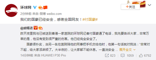 《环球时报》总编辑胡锡进今日发布微博宣布昨日遭到示威者攻击的环球网记者付国豪已经完全安全。同时也对香港警队表示了由衷的感谢。以下为微博详文: