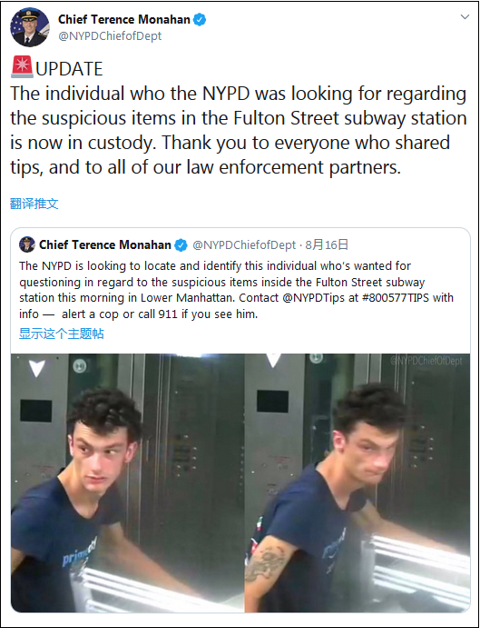 经过一天的追查,纽约警察局局长泰伦斯·莫纳汉在推特上宣布,在富尔顿地铁站内放置“可疑物品”的男子已被拘捕,警方在推特上发出了嫌疑人的照片,根据监控画面显示,这名男子在进地铁时,手上抱着一个电饭锅。