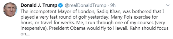 特朗普在第一条推文中写道,“无能的伦敦市长萨迪克·汗昨天因为我快速地打了一轮高尔夫而十分愤怒。许多人一锻炼就是几个小时,旅行得好几个星期,我,就很快地打了轮高尔夫(非常便宜)。奥巴马总统还会飞到夏威夷打呢”。↓