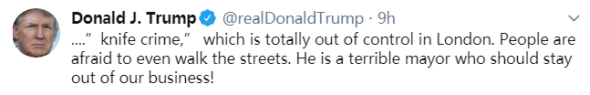 第二条推文中,特朗普又“数落”了一番萨迪克•汗的不是。他说,“汗应该关注的是“持刀犯罪,这在伦敦已经完全失去控制了。人们甚至不敢走在街上。他是个糟糕的市长,他不应该来管我们的事。”↓