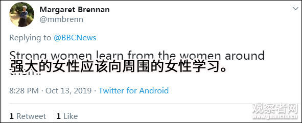 但也有网友认为,此话有些片面,强大的女性应该去影响别人,而且更应该向周围的女性学习,不一定非得是男人。
