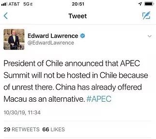 (智利总统宣布因为骚乱不在智利举办APEC峰会,中国提议澳门作为备选)