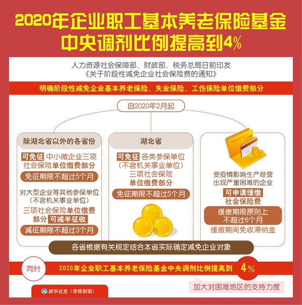 人力资源社会保障部、财政部、税务总局日前印发《关于阶段性减免企业社会保险费的通知》,明确阶段性减免企业基本养老保险、失业保险、工伤保险单位缴费部分。同时,2020年企业职工基本养老保险基金中央调剂比例提高到4%,加大对困难地区的支持力度。