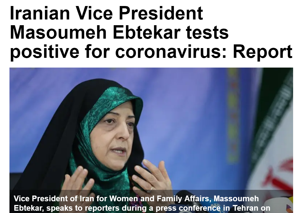 阿拉伯国有电视台援引伊朗伊斯兰共和国通讯社报道称,伊朗负责妇女和家庭事务的副总统玛苏梅·埃卜特卡尔的新型冠状病毒检测呈阳性。