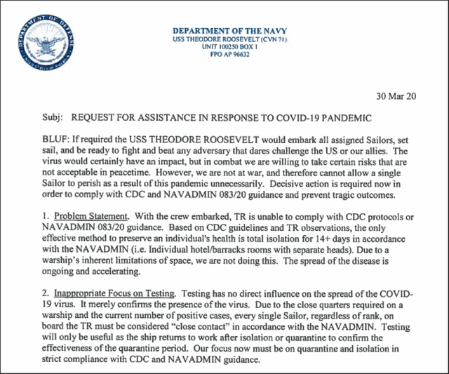 综合美国媒体报导,前“西奥多·罗斯福”号舰长克罗泽因船内发生大规模群聚感染写信向美国海军高层求助,要求让船员下船检疫。《旧金山纪事报》在上月31日率先披露克劳齐致函求援,让外界知悉航舰内部状况,尽管成功争取船员离舰检疫,但事后美国海军代理部长宣布克罗泽尔被撤职,原因是“判断失误”,夸大舰上疫情的严重性,也未能正确反映舰上实情,造成不必要恐慌。