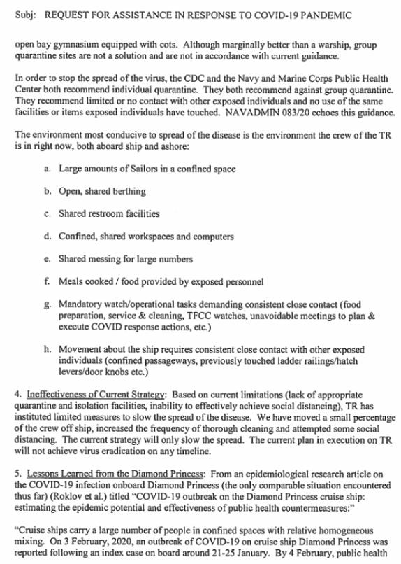 “罗斯福”号舰长的信件:3.没有合适隔离区域;4.现有应对举措无效,;5.吸取“钻石公主号”邮轮的教训。研究报告表明,邮轮只会加剧病毒的传播,如果没有早期隔离,80%的乘客和船员都会感染。罗斯福号的结局将是全体舰员均被感染。