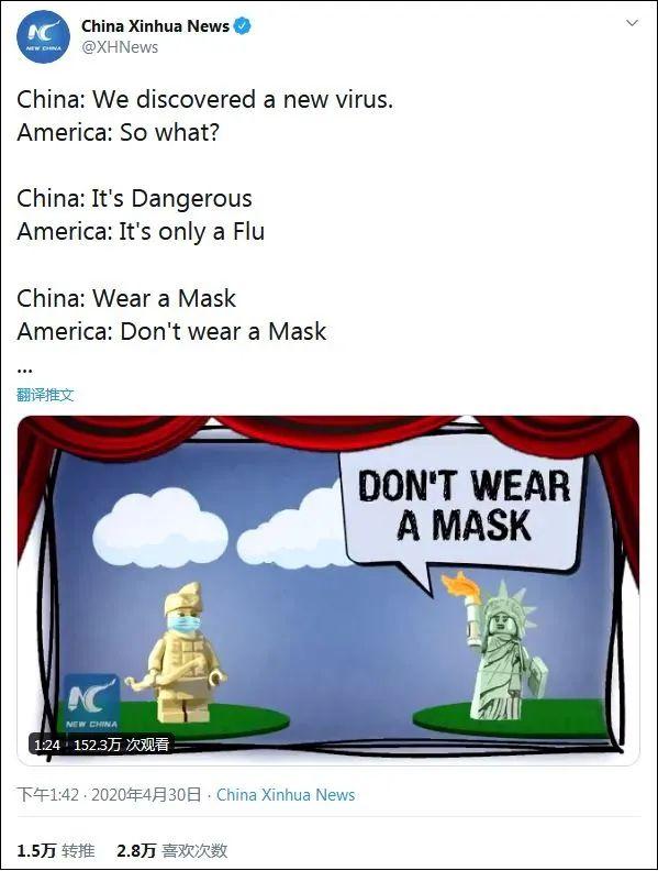 4月30日,新华社在其推特上发布了一则名为《病毒往事》(Once upon a Virus)的视频,获得广泛关注。
