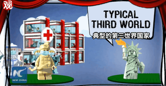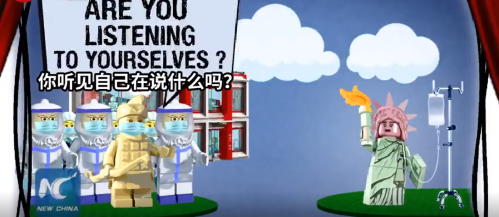 视频中,代表中国的兵马俑卡通小人不断地向世界发布新冠病毒的有效信息,而代表美国的自由女神卡通小人则不断地予以否认。