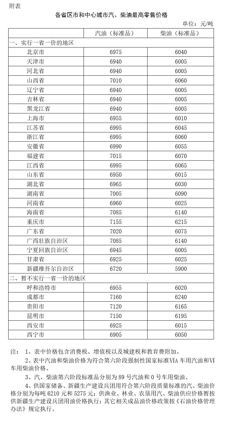 据发改委网站,根据近期国际市场油价变化情况,按照现行成品油价格形成机制,自2020年6月28日24时起,国内汽、柴油价格(标准品,下同)每吨分别提高120元和110元。调整后,各省(区、市)和中心城市汽、柴油最高零售价格见附表。相关价格联动及补贴政策按现行规定执行。
