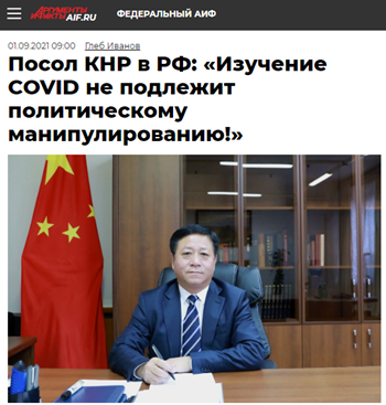 据中国驻俄罗斯使馆网站消息,2021年9月1日,中国驻俄罗斯大使张汉晖在俄罗斯《论据与事实报》发表题为《病毒溯源不容政治操弄》的署名文章,全文如下: