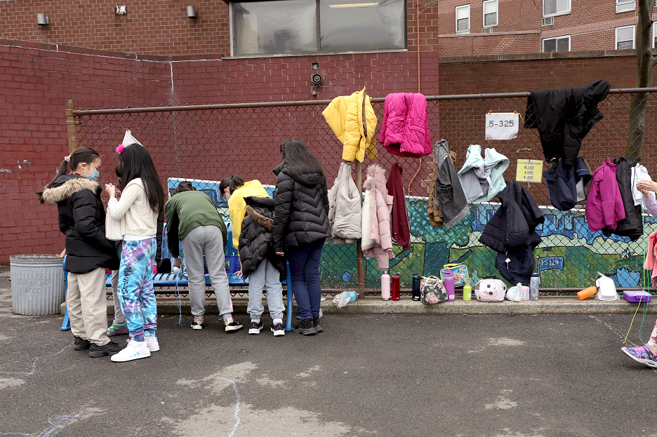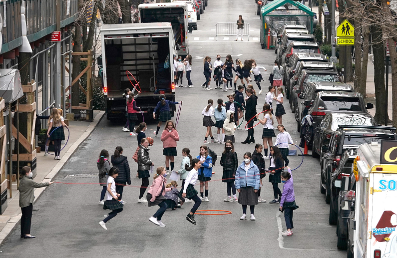 △当地时间3月7日,纽约市一学校学生们在室外玩耍。