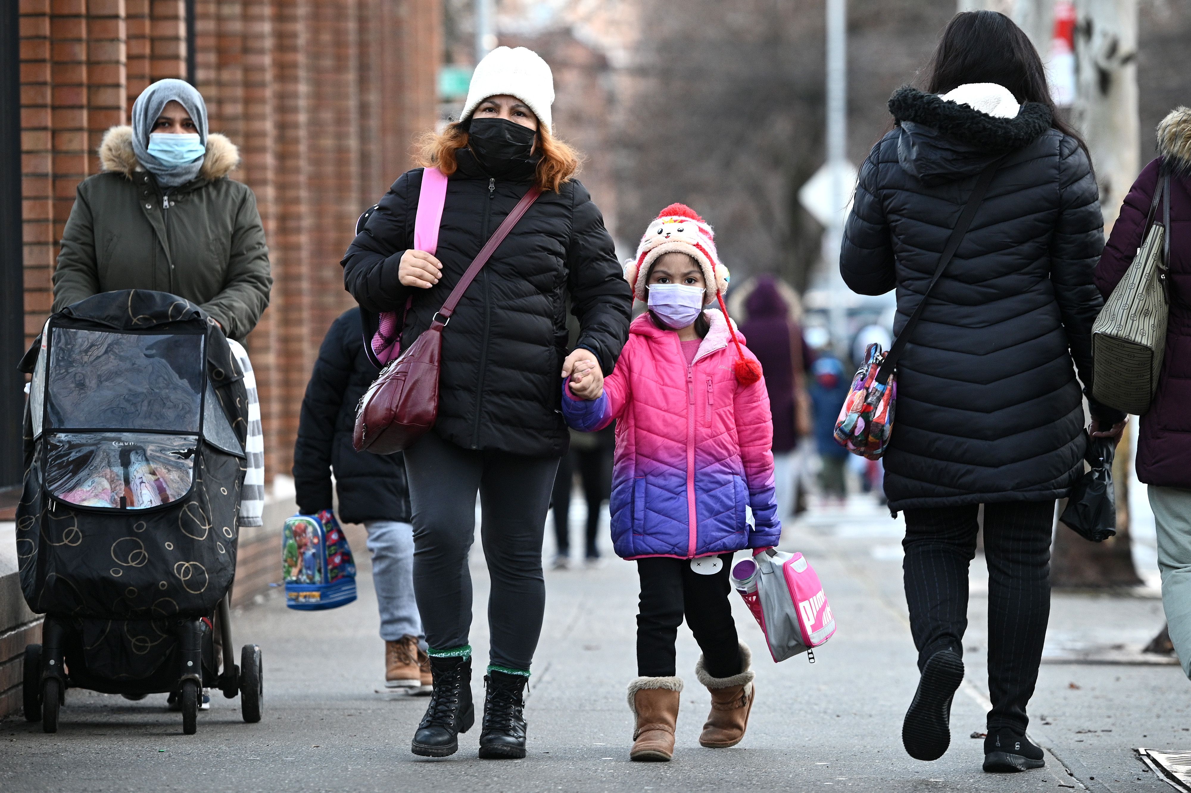 △当地时间2月8日,美国纽约的孩子们戴着口罩上学。