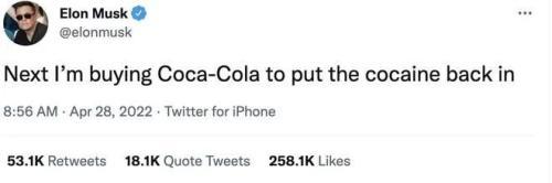 马斯克此前也曾在社交媒体上就其他事务发表过不严肃的内容。4月,马斯克曾在推特豪言要收购可口可乐,把可卡因重新加进去,但之后不了了之。