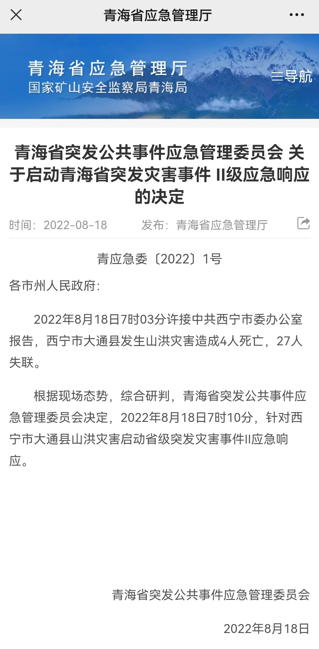 青海省应急管理厅网站8月18日消息,2022年8月18日7时03分许接中共西宁市委办公室报告,西宁市大通县发生山洪灾害造成4人死亡,27人失联。