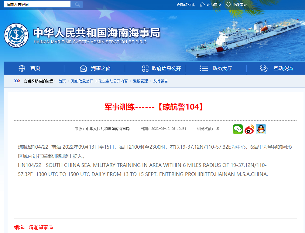 记者从海南海事局获悉,清澜海事局发布琼航警104/22,南海2022年09月13日至15日,每日21时至23时,在以19-37.12N/110-57.32E为中心,6海里为半径的圆形区域内进行军事训练,禁止驶入。
