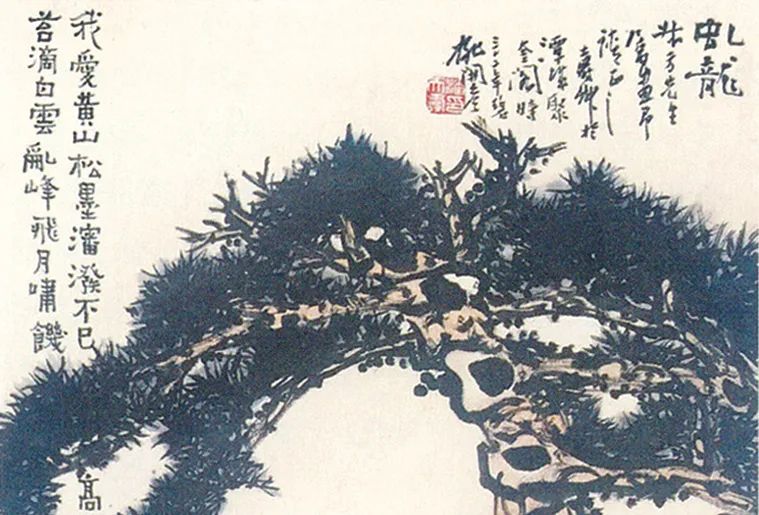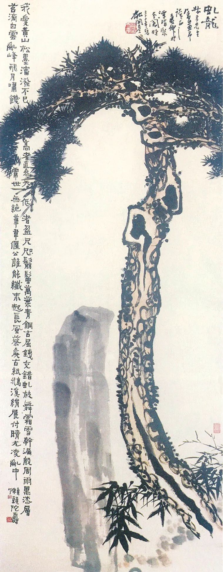 此潘天寿先生所作《奇松竹石图》,为六尺整纸边裁一截者,更见高长,潘翁也许是出于体现松之矫拔而有意为之。