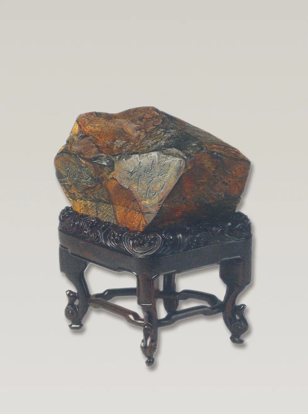 且配以红木水浪纹高架座,号“赤壁砚”。此砚丹赭古苍,包浆沉醇,宛若800年前古物。益信文物者,皆人为之,施以艺、着以文,日久则为文物矣。