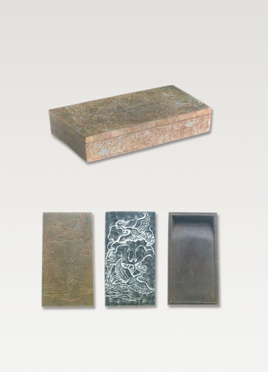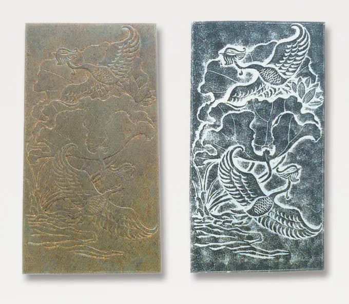 宋代的这一寻常的盖砚也足以作为解剖体悟的“麻雀”。画面是表现两只鸳鸯在莲花丛中拍翅追嬉。若以画艺论,双禽生动,变型得体,布局奇特,雅致有韵;而观其雕技,游刃恢恢,圆畅流动,深浅合辙,刀笔互补,尤添妙趣。点线面、黑白灰,无可挑剔。一件无名氏的砚刻即显示出宋代工艺美术水平的精妙绝伦,令人折服。