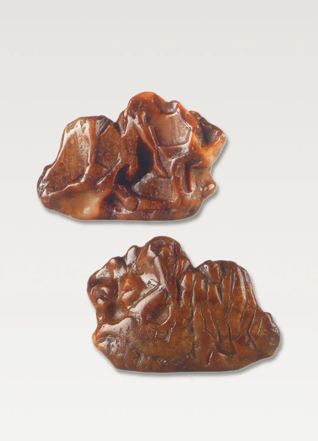 这是一件寿山掘性(指独石)鹿目石,旧称鹿目田,这不免有些抬高身价的成分在。巧匠不下一刀,听其自然,成了文人喜好的搁笔的山子,天成之美,自具文化。