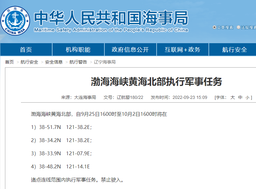 据中国海事局网站消息,大连海事局发布航行警告,自9月25日16时至10月2日16时,渤海海峡黄海北部执行军事任务,禁止驶入。