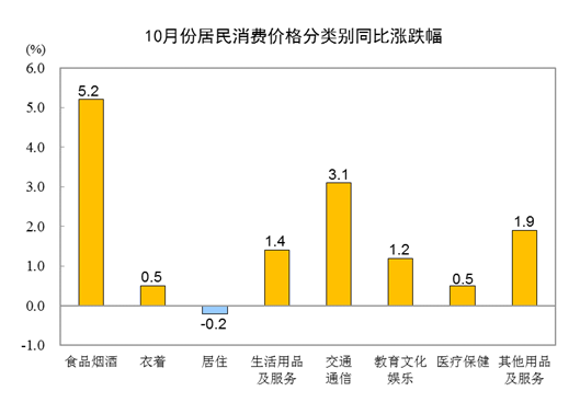 10月份,食品烟酒类价格同比上涨5.2%,影响CPI(居民消费价格指数)上涨约1.43个百分点。食品中,畜肉类价格上涨23.6%,影响CPI上涨约0.72个百分点,其中猪肉价格上涨51.8%,影响CPI上涨约0.64个百分点;鲜果价格上涨12.6%,影响CPI上涨约0.23个百分点;蛋类价格上涨11.8%,影响CPI上涨约0.08个百分点;粮食价格上涨3.6%,影响CPI上涨约0.06个百分点;水产品价格上涨2.8%,影响CPI上涨约0.05个百分点;鲜菜价格下降8.1%,影响CPI下降约0.19个百分点。