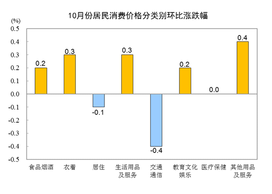 10月份,全国居民消费价格环比上涨0.1%。其中,城市持平,农村上涨0.1%;食品价格上涨0.1%,非食品价格持平;消费品价格上涨0.1%,服务价格持平。