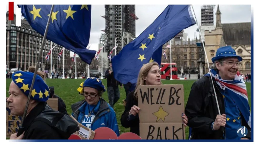 △近日,英国民众在英国议会前呼吁重返欧盟