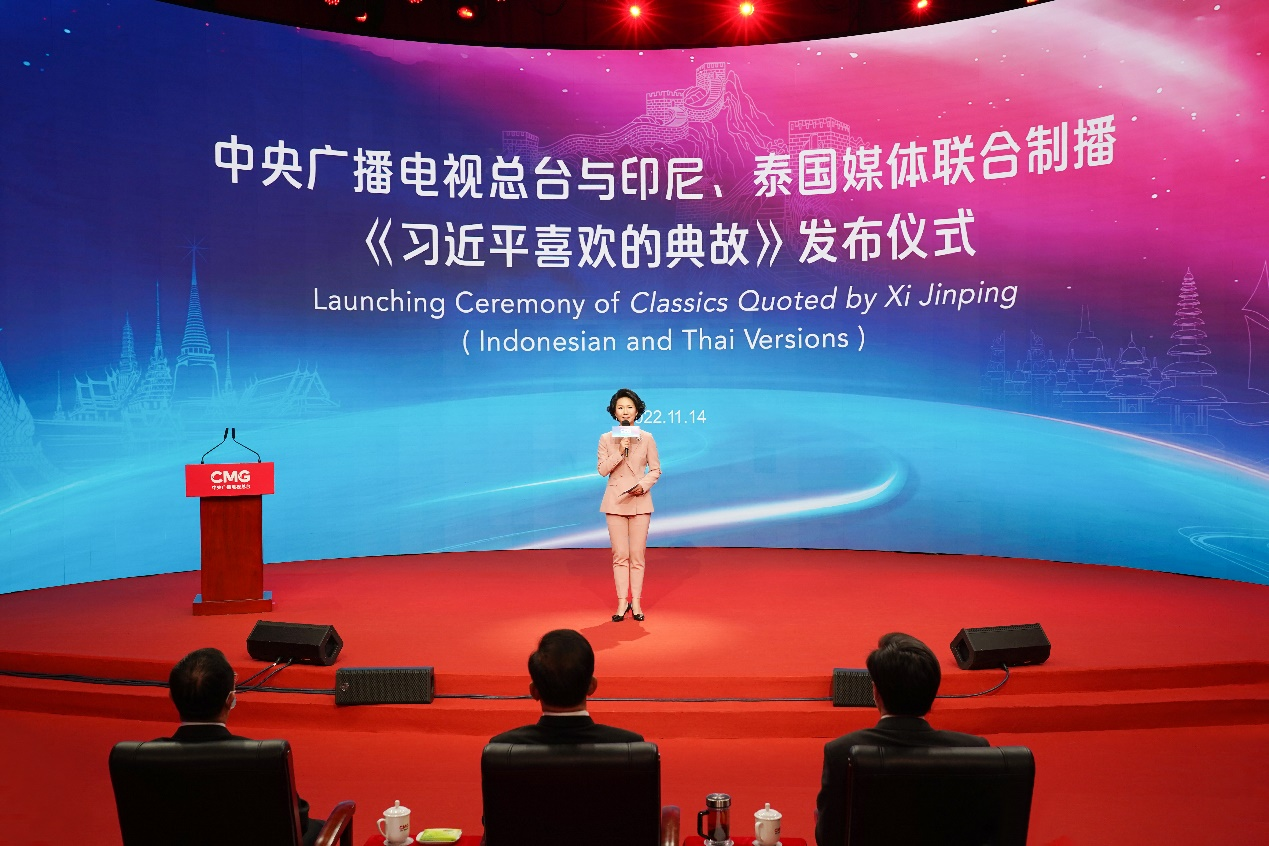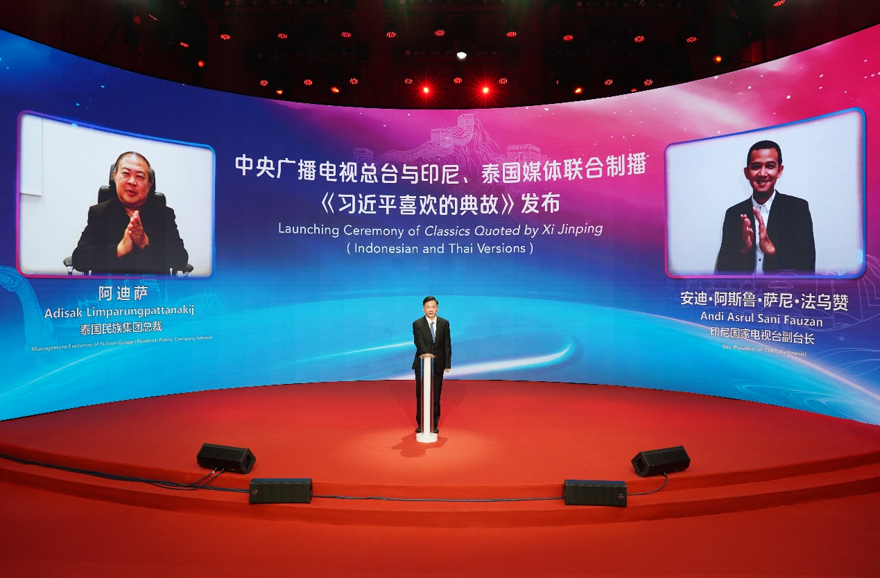 11月14日,在中国国家主席习近平前往印尼出席G20峰会、前往泰国出席亚太经合组织首脑非正式会议并进行访问之际,中央广播电视总台专题片《习近平喜欢的典故》(印尼语版、泰语版)暨多语种纪录片《中国,新的征程》开播仪式在北京举行。中宣部副部长、中央广播电视总台台长慎海雄出席并致辞。印度尼西亚、泰国、柬埔寨、印度、老挝、尼日利亚、巴基斯坦、斯里兰卡、土耳其等多国国家电视台台长和主流媒体负责人线上出席开播仪式。