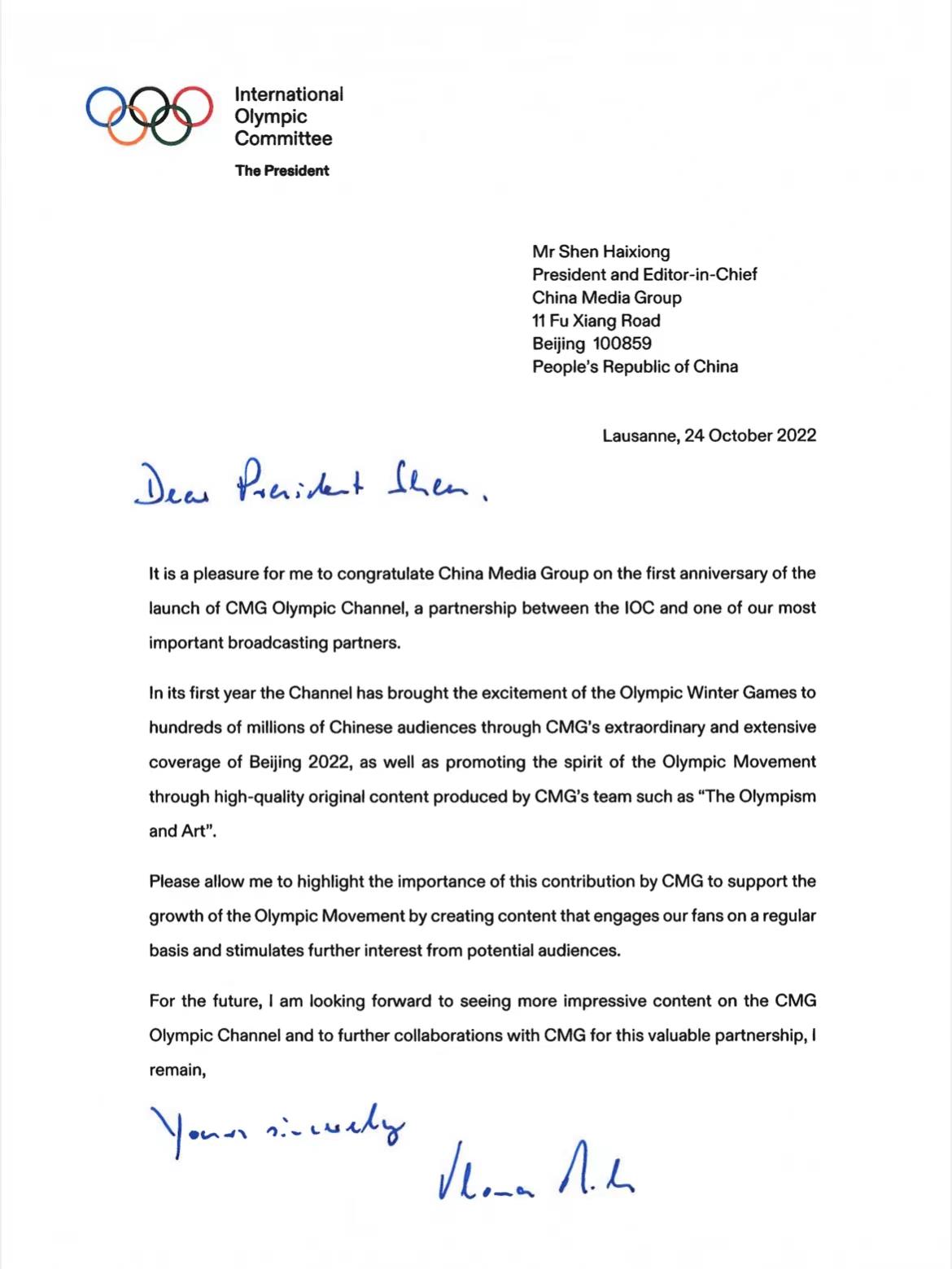 国际奥委会主席巴赫在贺信中指出,中央广播电视总台是国际奥委会在全球最重要的媒体伙伴之一,双方友好的合作关系至关重要。奥林匹克频道在开播的第一年里,已经通过精彩卓越的转播报道向亿万中国观众生动呈现了激动人心的北京2022冬奥会,同时依托《艺术里的奥林匹克》等高质量原创节目,大力弘扬奥林匹克精神,收视人群不断拓展扩大。